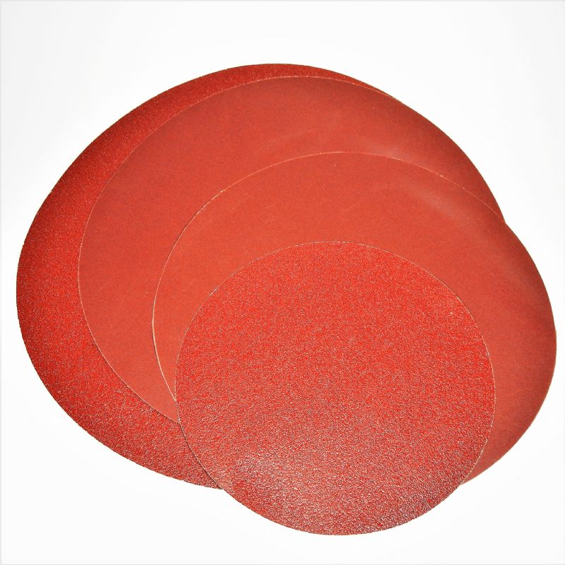 Dischi di carta abrasiva resinata rossa di tipo pesante supporto carta manila, corindone temperato di prima qualità cosparsione chiusa. Utilizzati per: sgrossatura, sverniciatura, restauro.