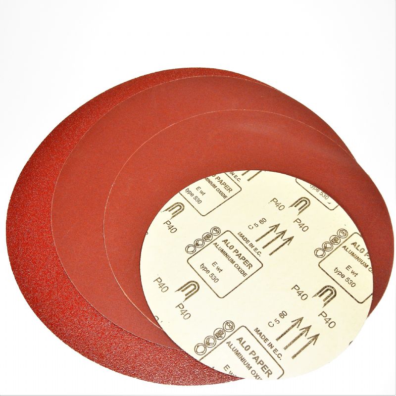 Dischi di carta abrasiva resinata rossa di tipo pesante supporto carta manila, corindone temperato di prima qualità cosparsione chiusa. Utilizzati per: sgrossatura, sverniciatura, restauro.